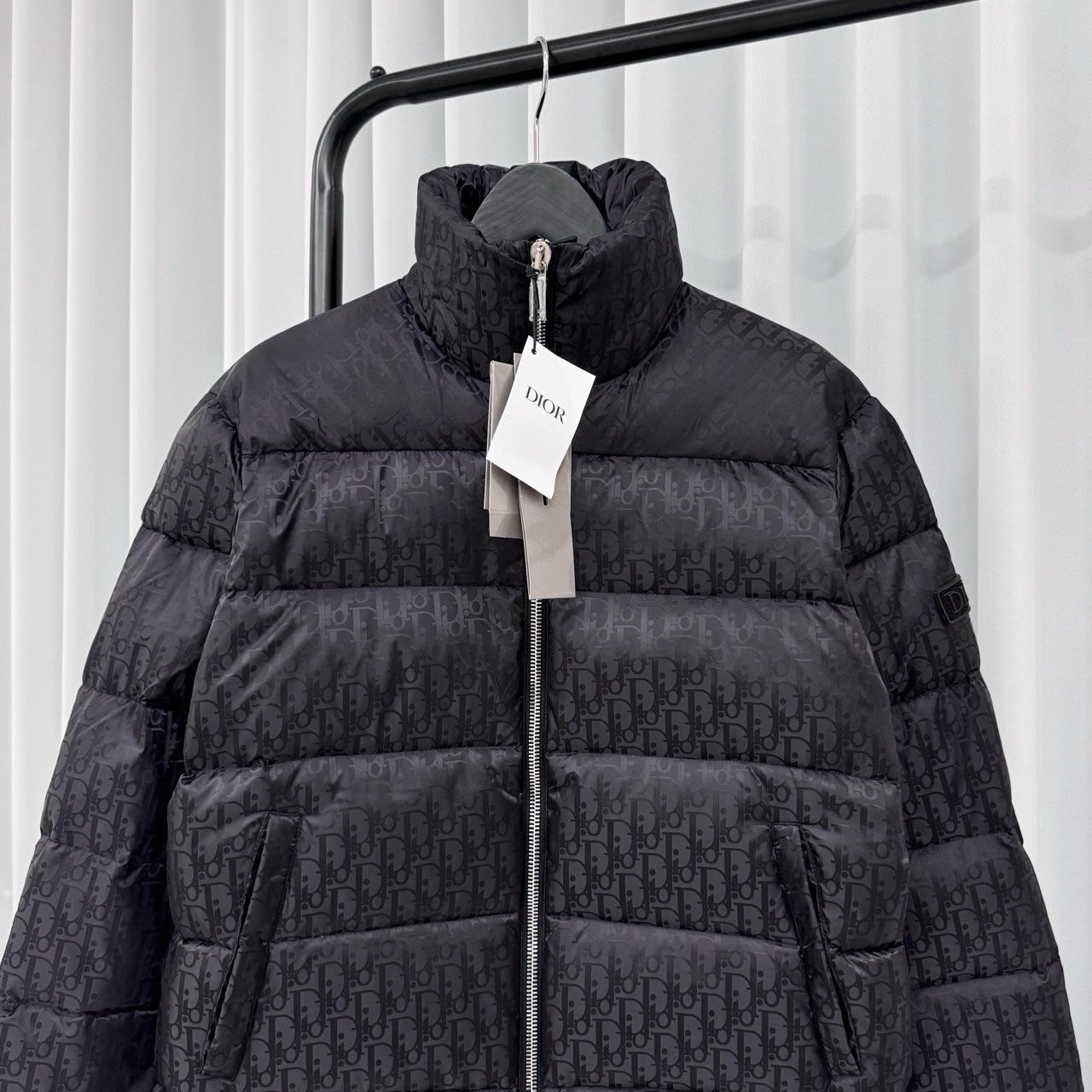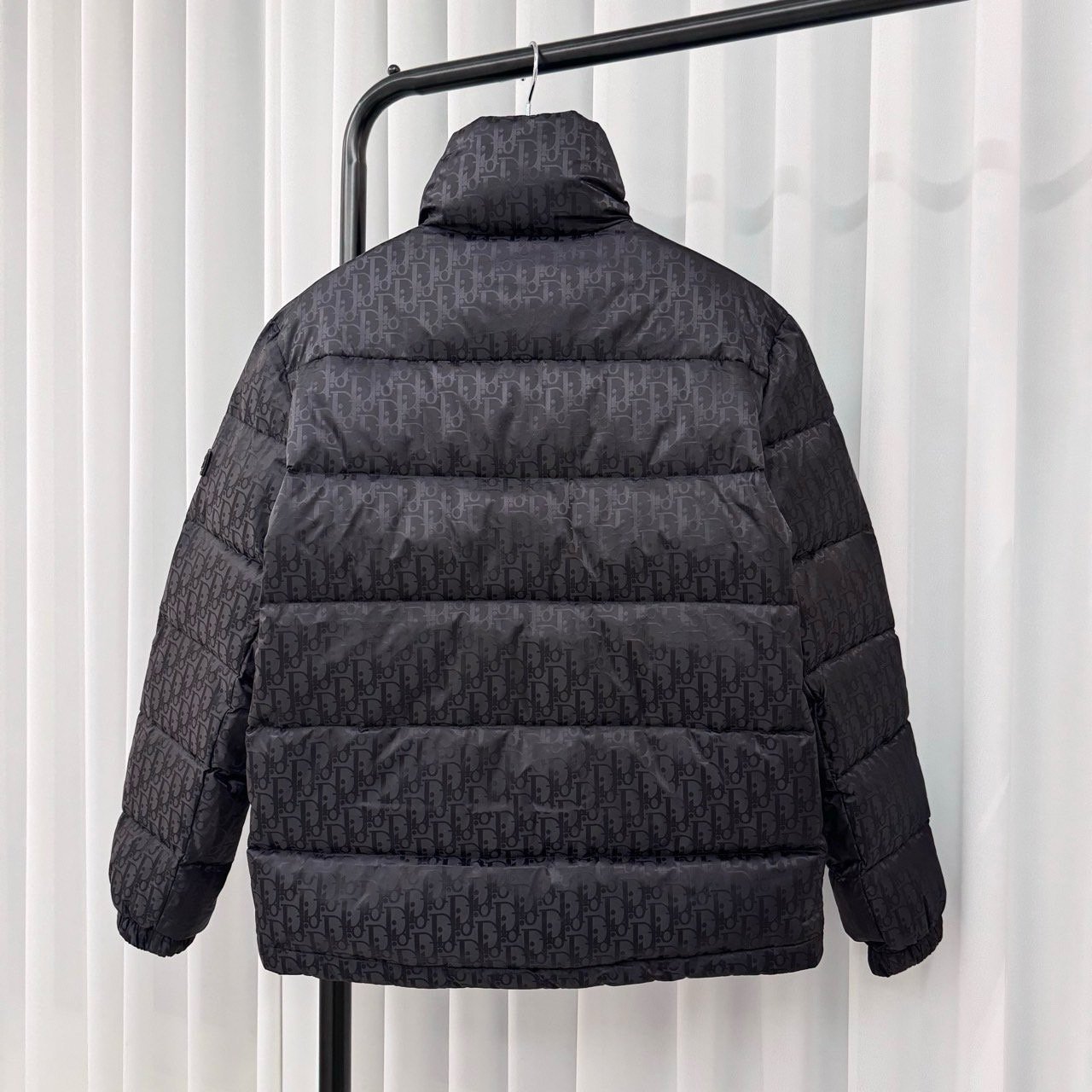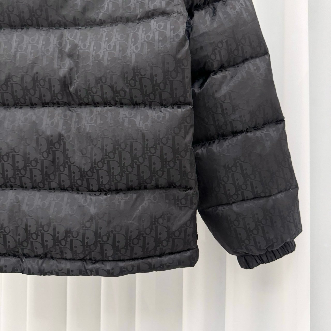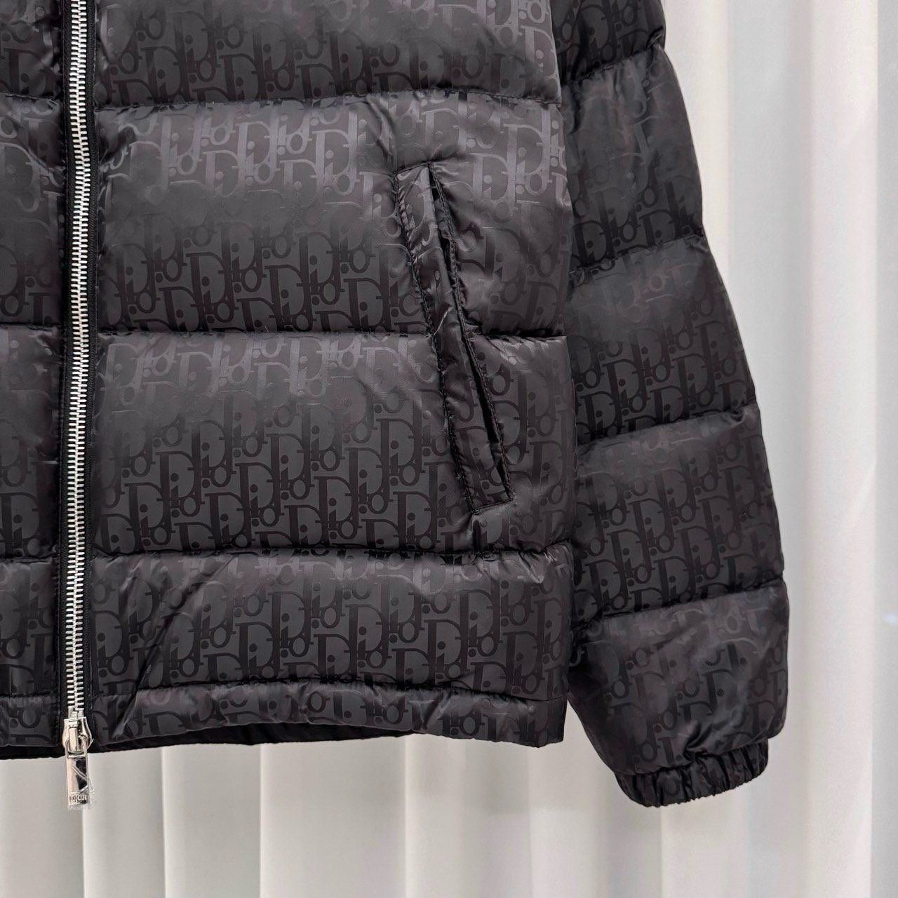 💬톤온톤의 오블리크 자카드 다운패딩으로 스탠드 카라, 디올 로고 인그레이빙 지퍼 양방향 클로징 및 소매의 디올 패치가 포인트인 제품으로 가볍고 편하게 착용가능한 클린핏 디자인
