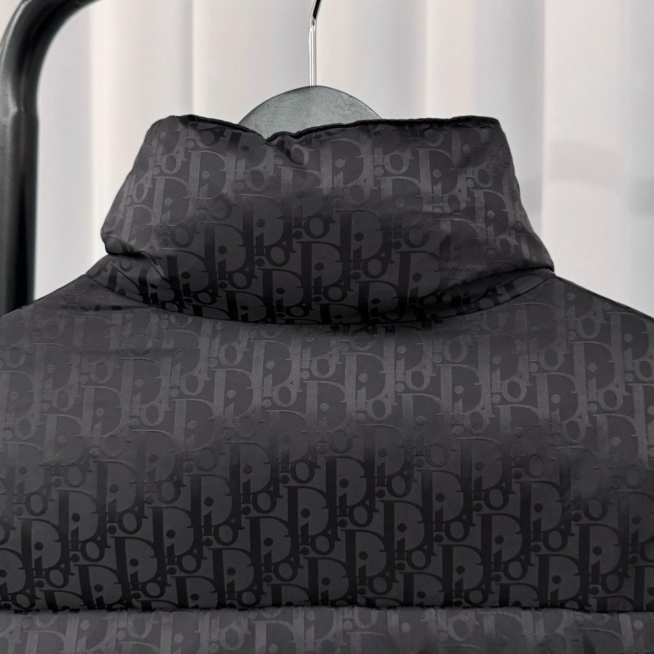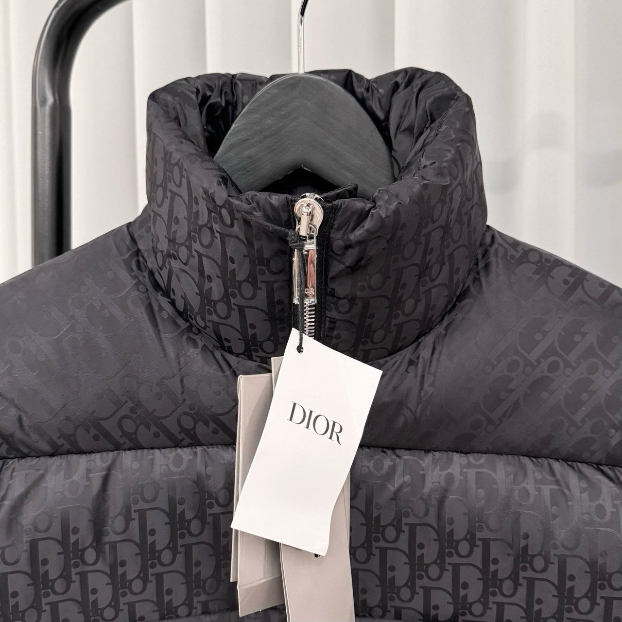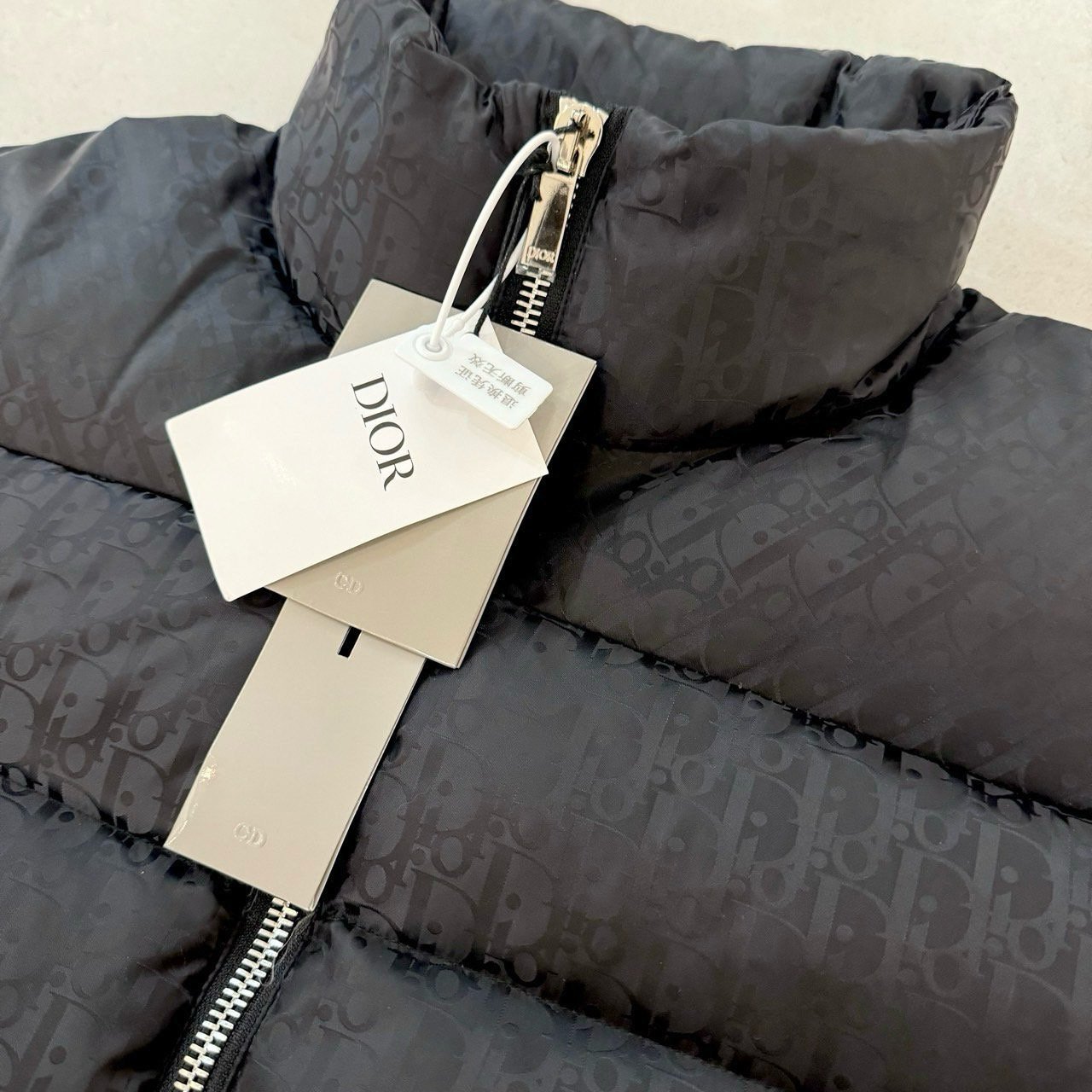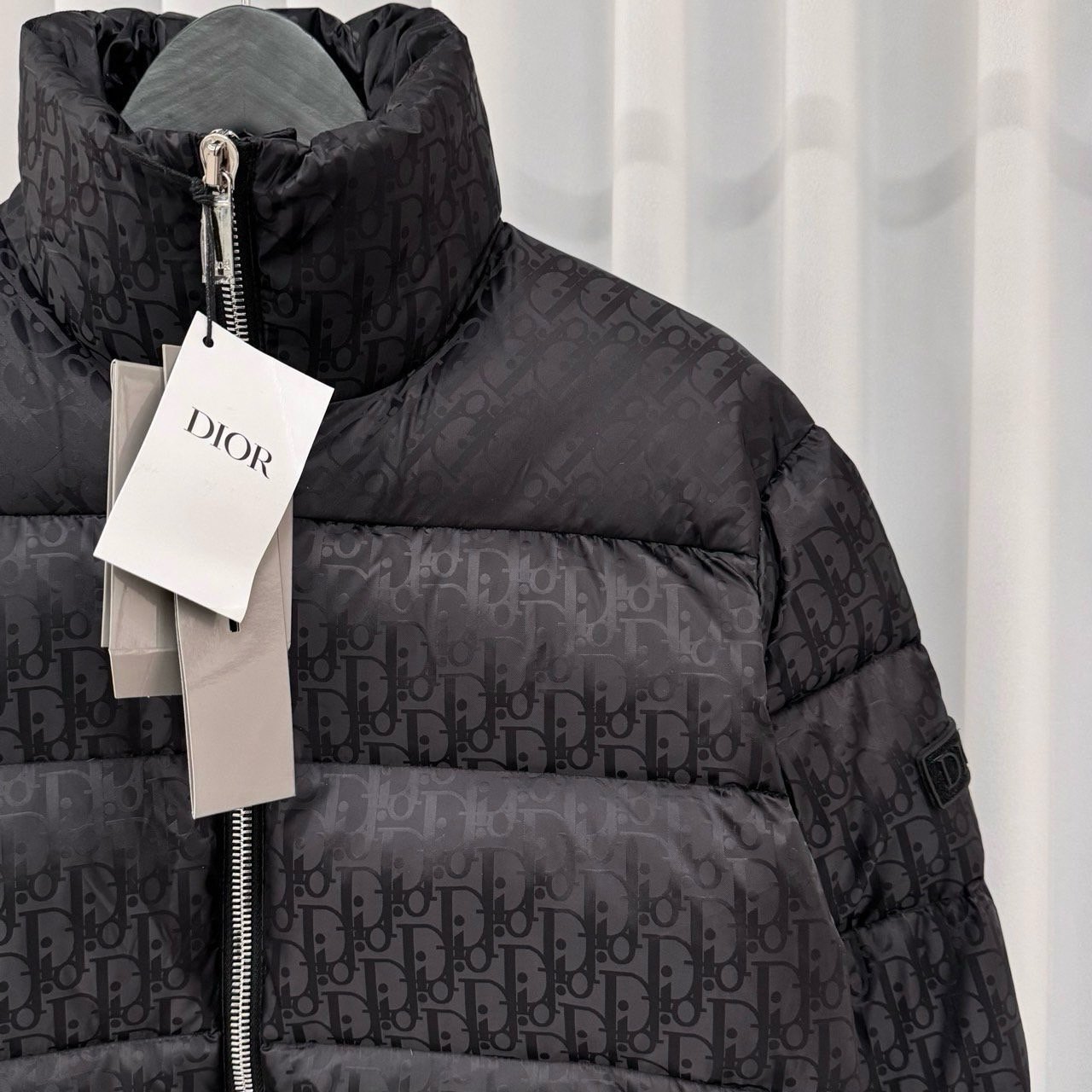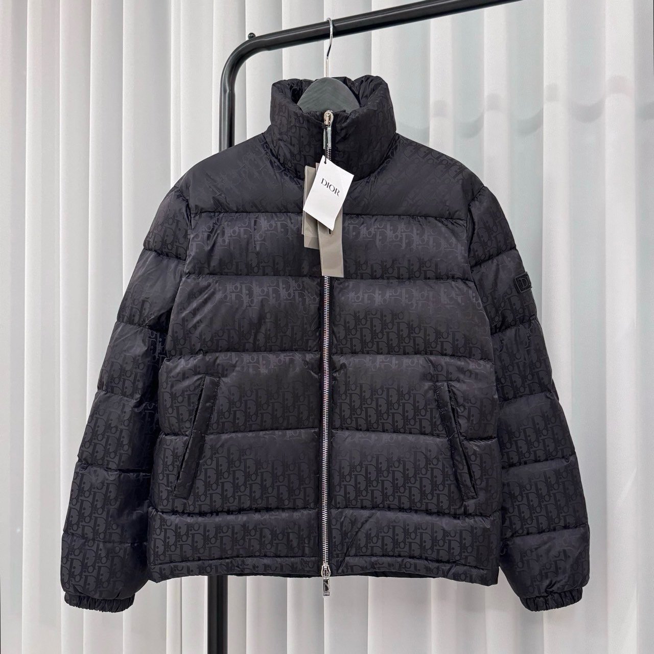 💬톤온톤의 오블리크 자카드 다운패딩으로 스탠드 카라, 디올 로고 인그레이빙 지퍼 양방향 클로징 및 소매의 디올 패치가 포인트인 제품으로 가볍고 편하게 착용가능한 클린핏 디자인