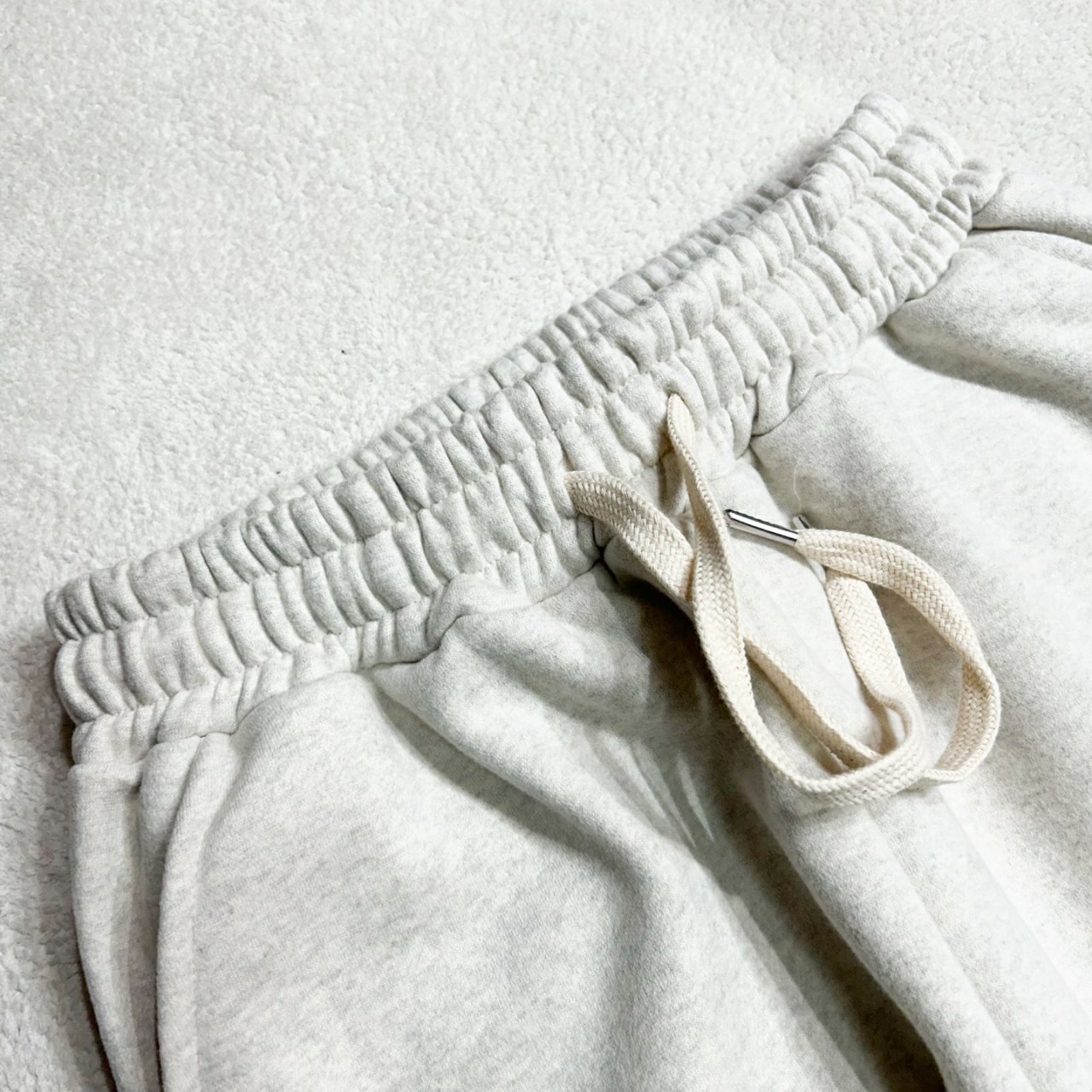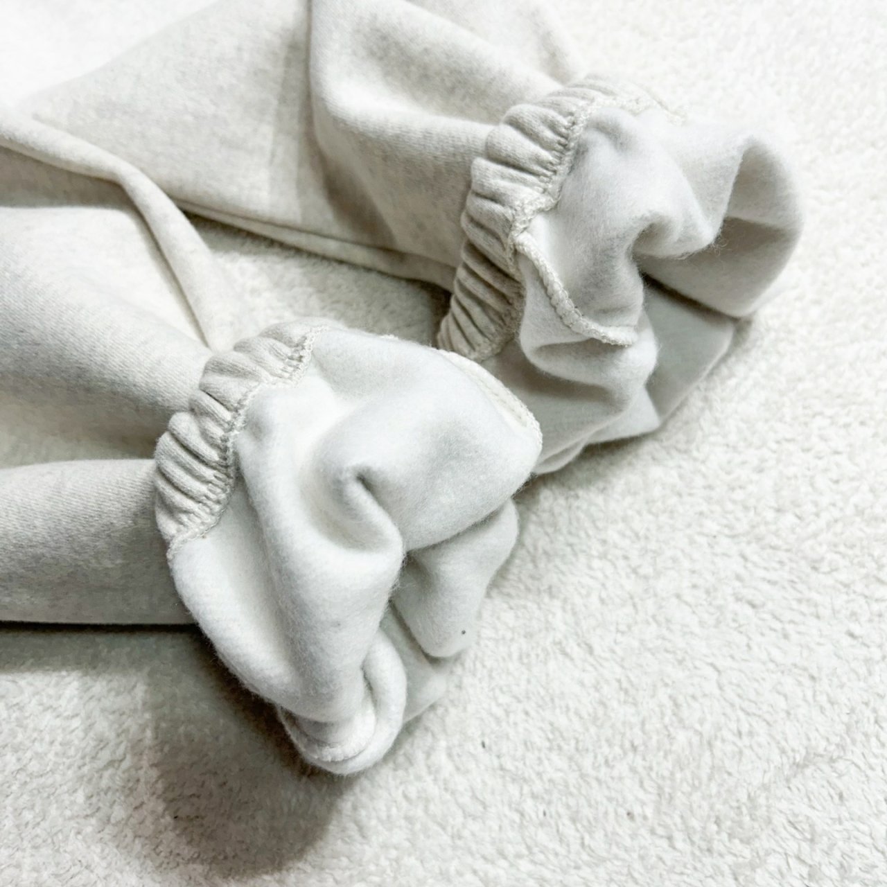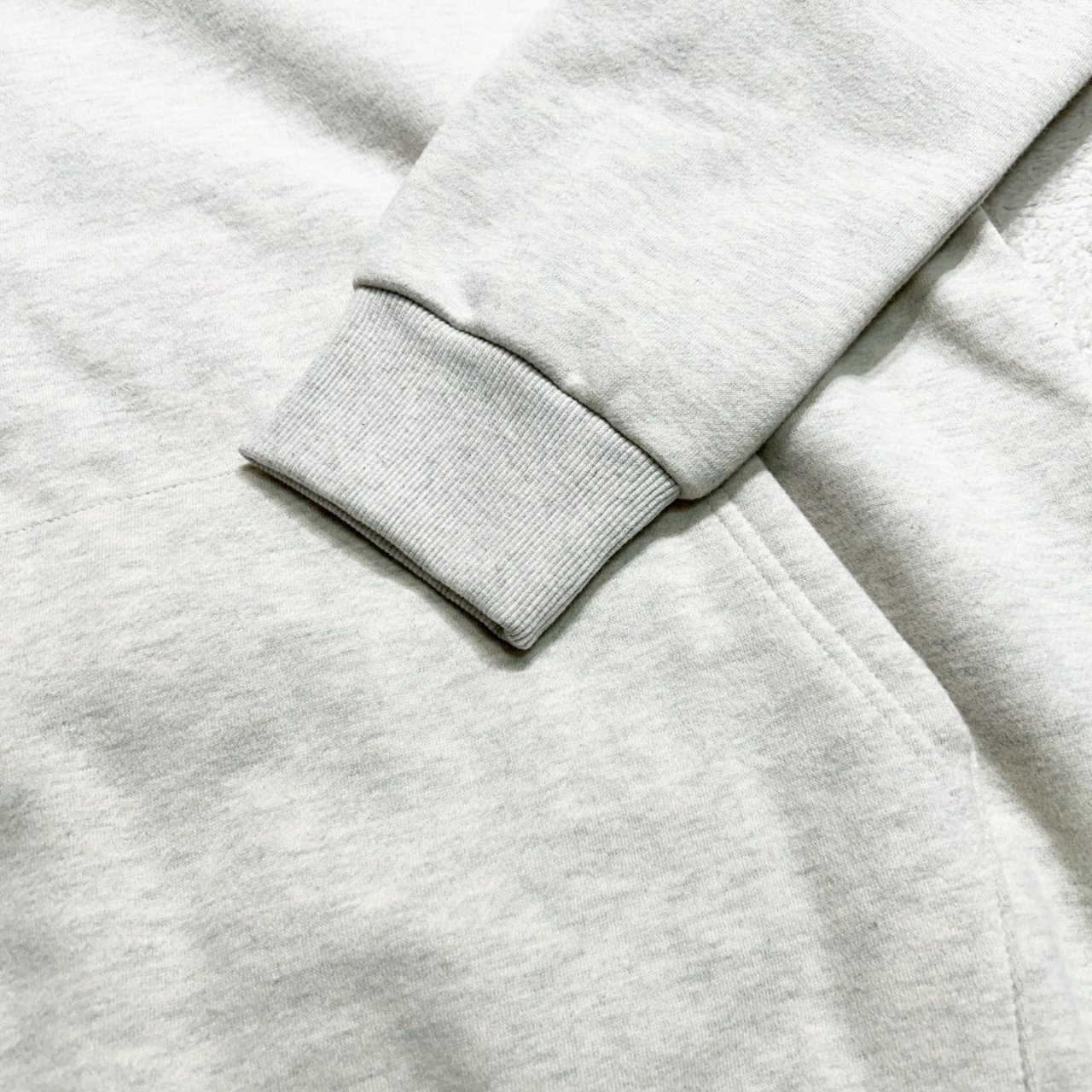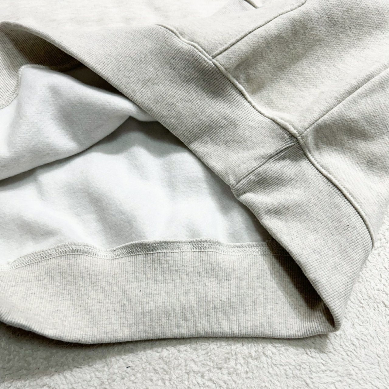 앞면은 싱글 조직, 뒷면은 루프 조직에 도톰한 기모 공정을 거쳐 제작된 원단입니다