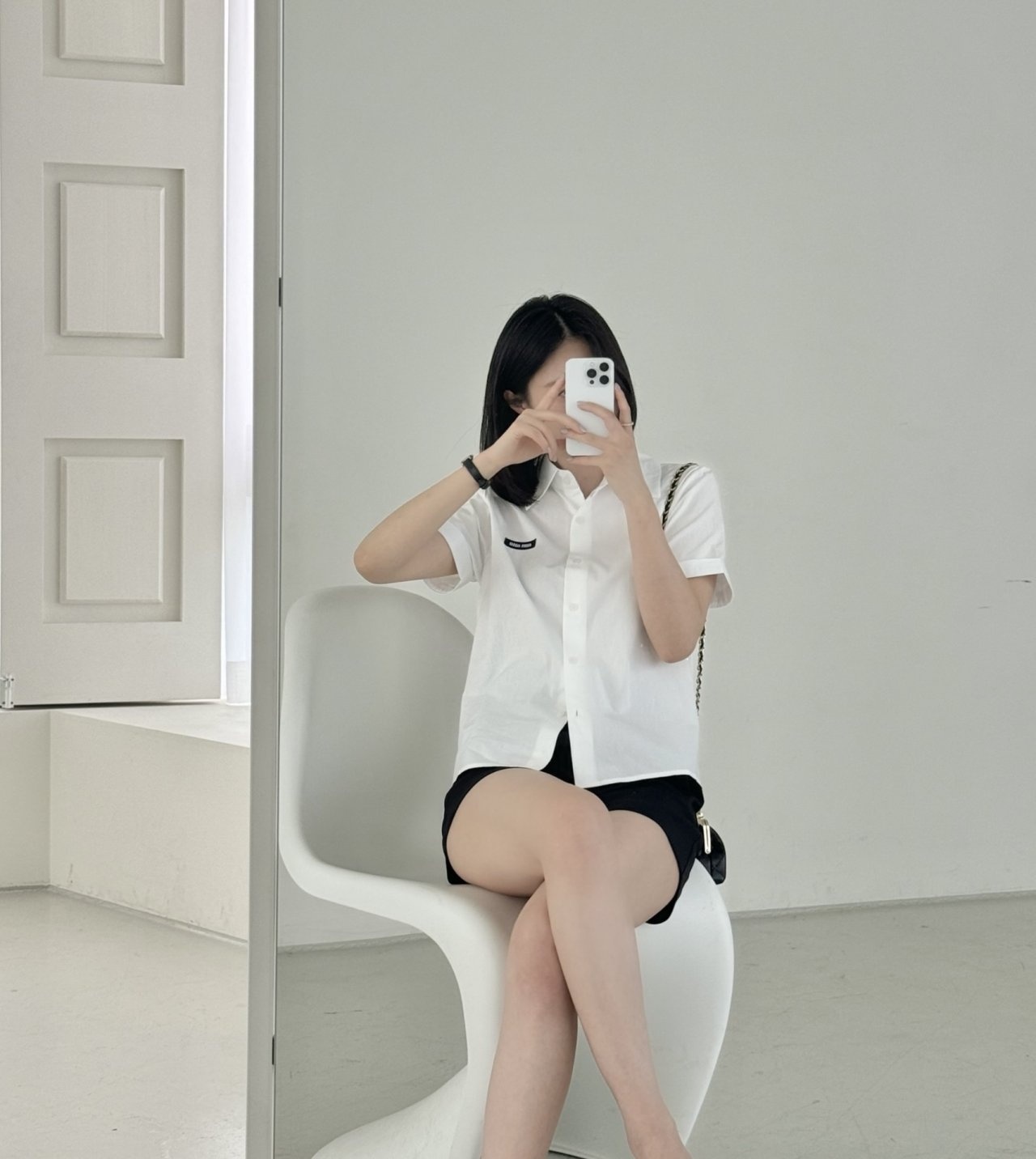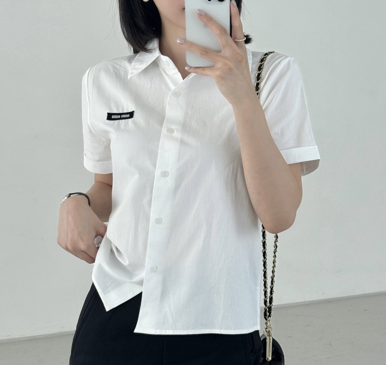 정제된 각도감의 카라라인과 미우미우 특유의 라벨 디테일이 미니멀한 무드에 브랜드 아이덴티티를 더해줍니다.