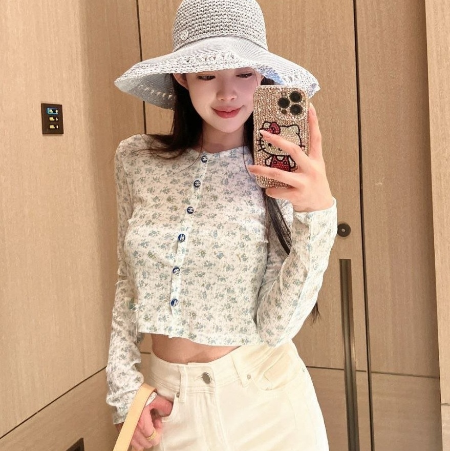 •블루 톤의 무드가 돋보이는 달콤하고 귀여운 미니 플라워 패턴입니다. 시각적으로 더 시원해 보이게 해주는 스타일로, 얇은 가디건 하나만으로도 분위기가 확 살아납니다. 정말 예쁘고 세련된 느낌이에요. 인스타에서 인기 많은 샤* 스타일의 꽃무늬 탑으로, 맞춤 제작한 원단과 단추 등 디테일이 정교합니다.