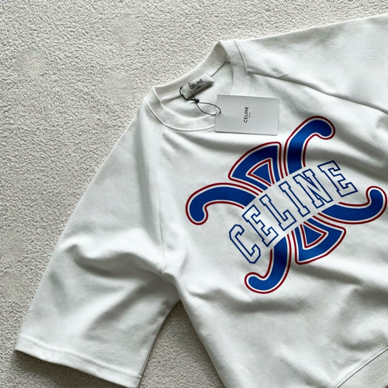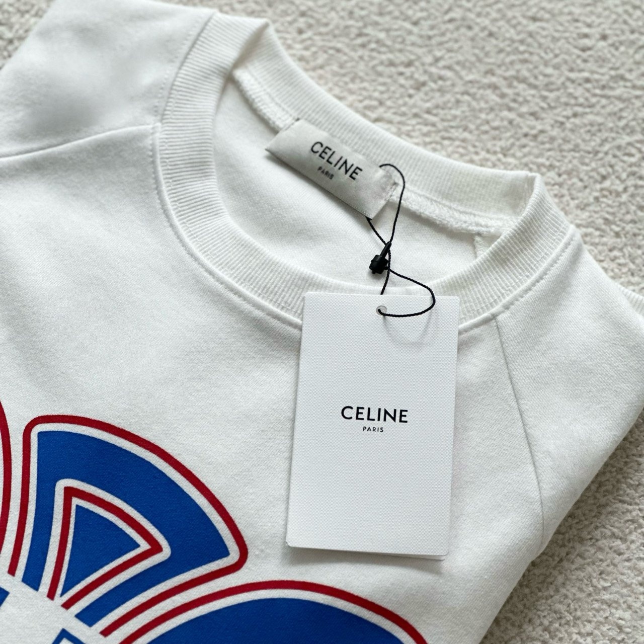 ▪ CELINE 트리오페 로고 프린트 (동일 펀칭) 새로운 전사 공법인 dsp 열처리를 하여 165도에서 10초 뒤 다시 10초 3번을 반복하여 밀어내는방식을 사용으로 전사나염의 구겨짐이나 크랙이 발생하지 않고 더 곱고 부드러우며 견뢰도가 높습니다. CELINE라벨 , 케어라벨 부자재를 자체제작하여 싸구려품들과 다르게 높은 완성도와 퀄리티를 자랑합니다.